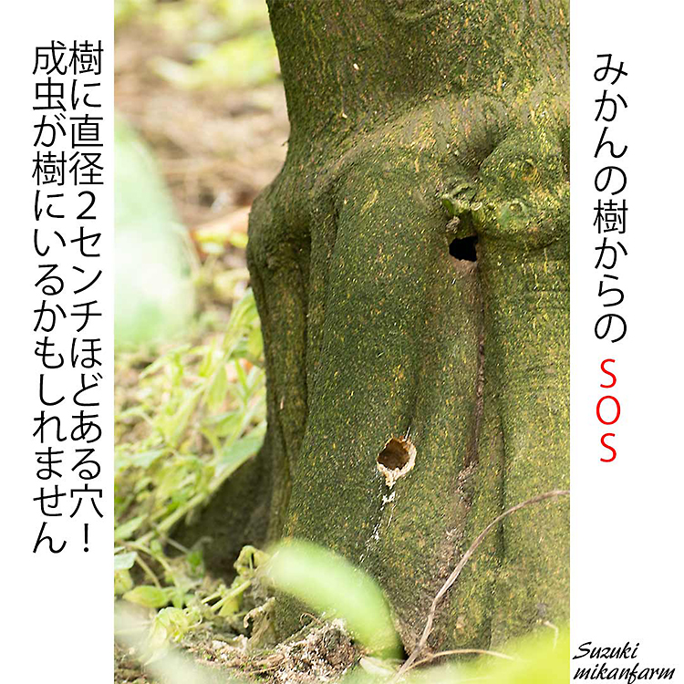 トップ画像のような木くずが落ちていたり、樹の幹から樹液が出ていると、それはみかんの木からの『SOS』のサイン!